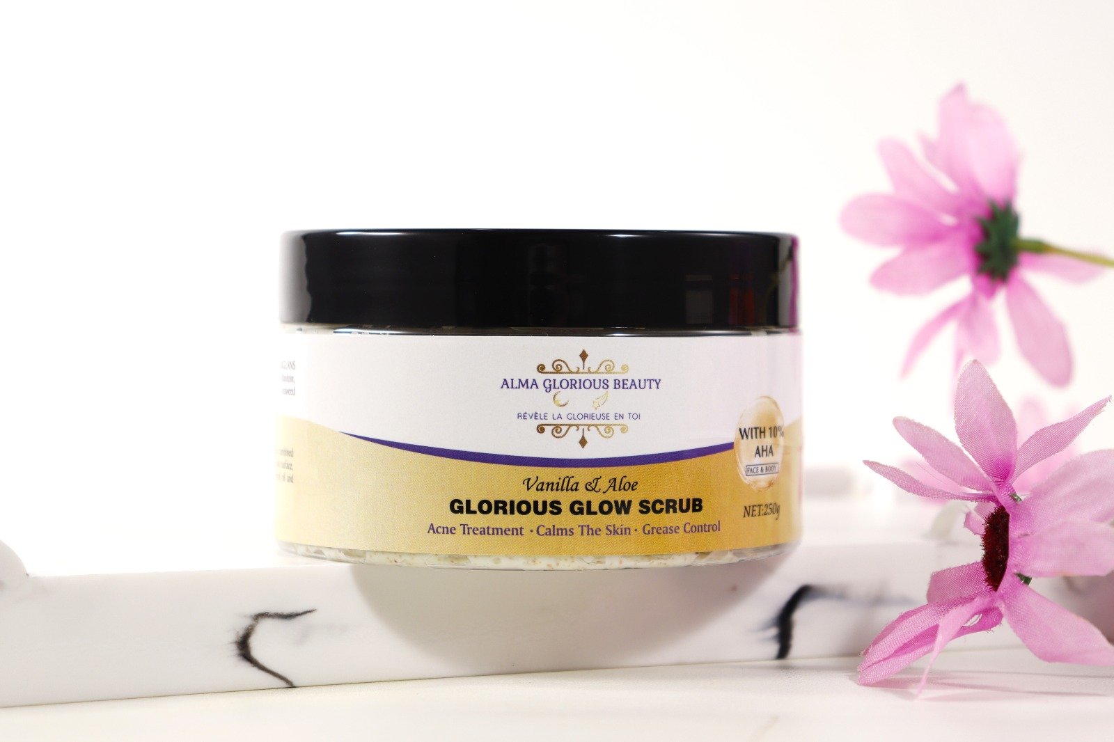 C’est connu, une exfoliation mécanique est idéale afin d’avoir une peau neuve; avec notre gommage glorieux visage et corps, attendez-vous à avoir un éclat glorieux tout en éliminant l’acné de l’intérieur vers l’extérieur. Organique, Sans Sulfate, Sans Silicone, Sans Paraben, Sans parfum, Sans cruauté sur les animaux ,Vegan, constitué principalement d’AHA et d’Aloe Vera, ce gommage visage et corps saura vous séduire.