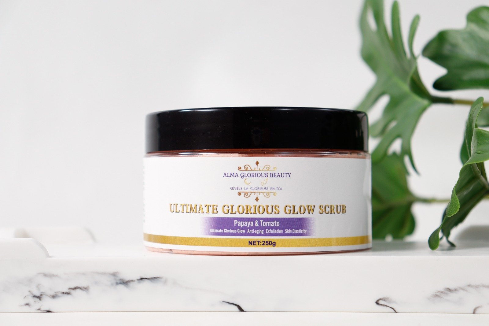 C’est connu, une exfoliation mécanique est idéale afin d’avoir une peau neuve; avec notre gommage ultime visage et corps, attendez-vous non seulement à avoir un éclat glorieux, mais aussi, notre gommage à la vitamine A, B, C, à l’extrait de graines de Juglans regia (noyer) et à la papaye viendra travailler le vieillissement et l’élasticité de votre peau.