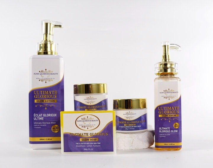ULTIMATE GLORIOUS GLOW de ALMA GLORIOUS BEAUTY, est un ensemble de soins organiques et végétaliens pour la peau sans silicone, sans hydroquinone, sans Sulfate, sans parabène, sans cruauté sur les animaux. Principalement fait de concentré de Rétinol, Collagène, Arbutine, miel, extrait d’escargot, Niacinamide, Acide kojique, Vitamines B5, C & E, Aloe Vera;